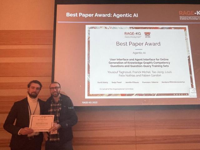 Yousouf Taghzouti, Franck Michel, Tao Jiang, Louis-Felix Nothias et Fabien Gandon ont reçu le prix du meilleur article « User Interface and Agent Interface for Online Generation of Knowledge Graph’s Competency Questions and Question-Query Training Sets » au Workshop RAGE-KG 2025 qui s'est tenu à Nara, Japon.